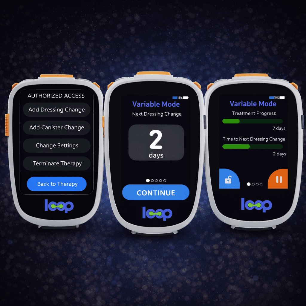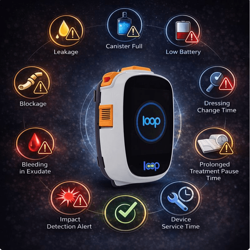 Loop elevates treatment safety to the next level with an innovative approach that goes beyond standard NPWT alarms. All alarm events are recorded with timestamps and presented to the user in the event logs interface for full traceability.